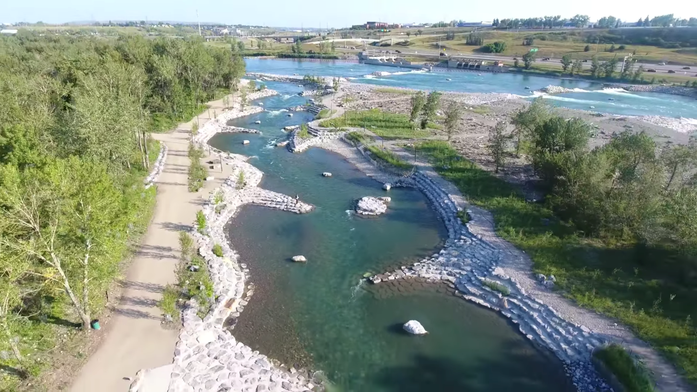 One example is the portage west of the Zoo Bridge, called Harvie Passage. Located here was an impassable weir built by the CPR to feed an irrigation canal. In 2018, following flood damage repairs, a whitewater park was opened.